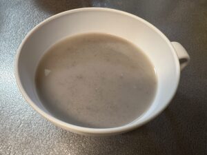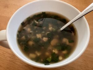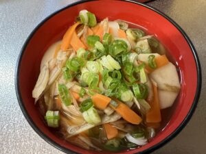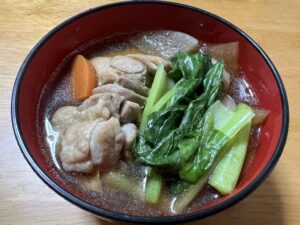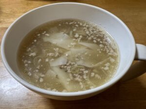 お雑煮も和風のものが多いので、たまには中華風のものをと、ニラと豚肉で中華スープを作り、そこにお餅を入れることにしました。
