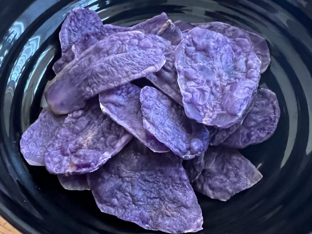 農産物直売場のジャガイモコーナーで、ノーザンルビーと一緒にシャドークイーンも見つけて購入しました。 シャドークイーンは、北海道で開発されたアントシアニンが含まれた赤紫色のジャガイモです。 この色を活かして今回は、レンジでポテトチップスを作...
